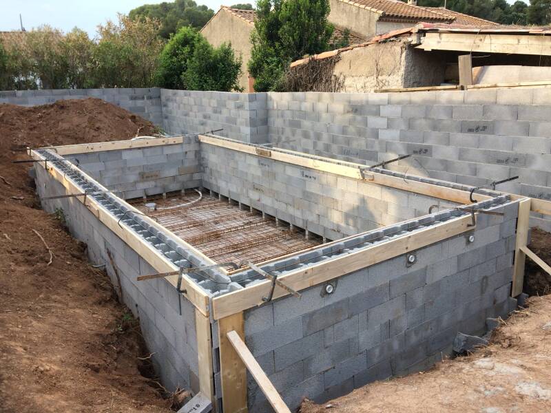 Bassin construit en bancher de 27 ou 20 , ferraillage du radier treillis-soudé st25 nappe inférieur et supérieur avec séparateur chaînage 10x10 et équerrage relier au parois. Coulage béton hydrofuger ou simple avec camion toupille et pompe . Création d'une plage et marches pour enfin un dressage d'enduit du bassin.
